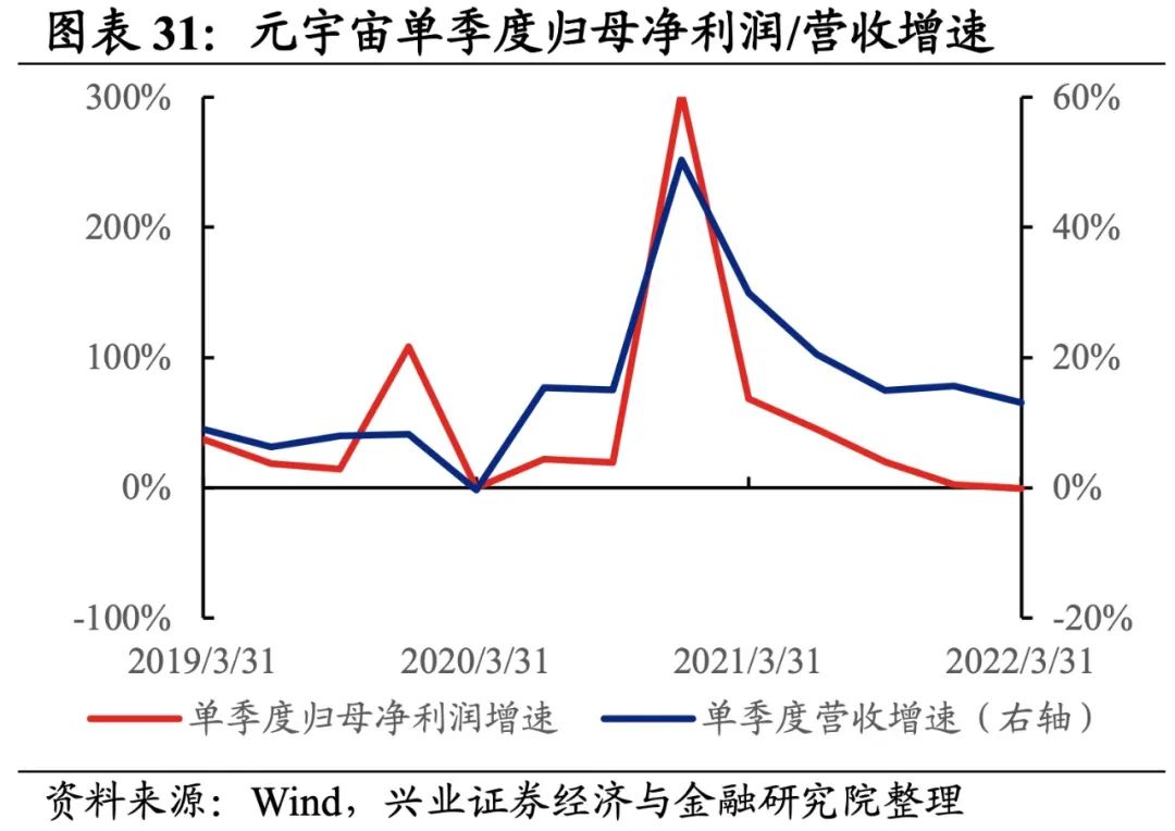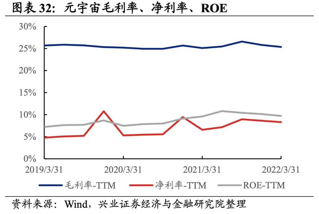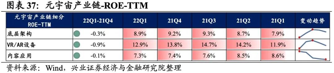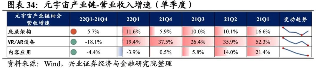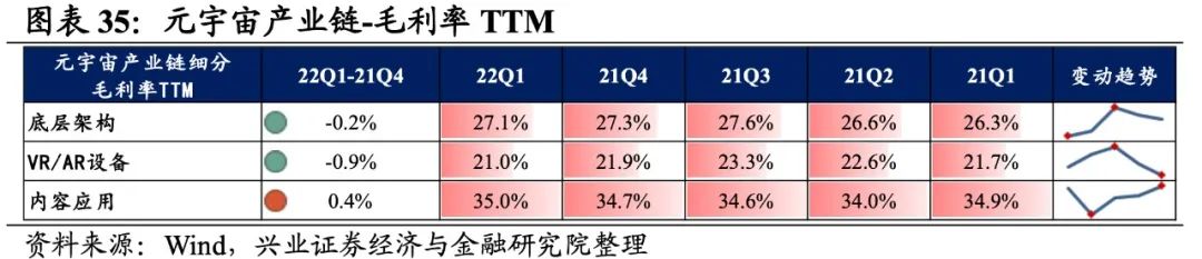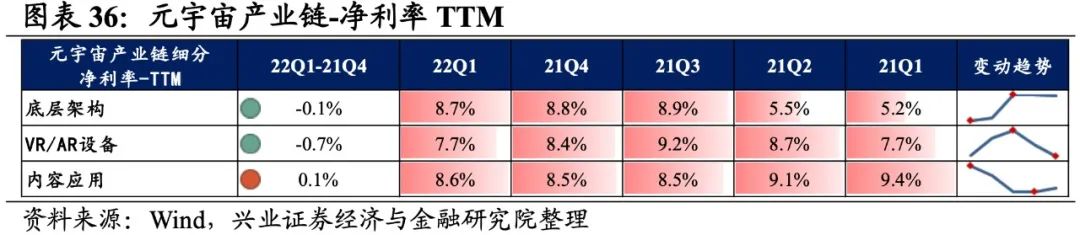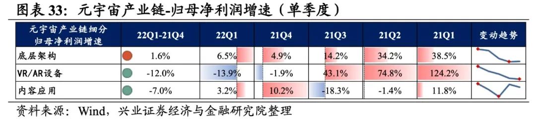 元宇宙产业链归母净利润增速持续回落,盈利能力有所回落。从元宇宙产业链整体来看,22Q1单季度归母净利润增速、营收增速分别是-0.71%、13.09%,较21Q4单季度增速分别回落3.1pct、2.5pct,归母净利润增速持续回落至负区间。盈利能力有所回落,毛利率、净利率、ROE下滑0.5pct、0.3pct、0.4pct。