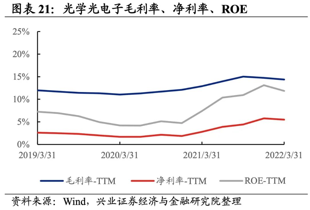 光学光电子产业链归母净利润增速大幅回落至负增长,盈利能力有所回落。从光学光电子产业链整体来看,22Q1单季度归母净利润增速、营收增速分别是-26.95%、-12.08%,较21Q4单季度增速分别回落680.4pct、回升3.8pct,归母净利润增速大幅回落至负增长。盈利能力有所回落,毛利率、净利率、ROE下降0.4pct、0.3pct、1.3pct。