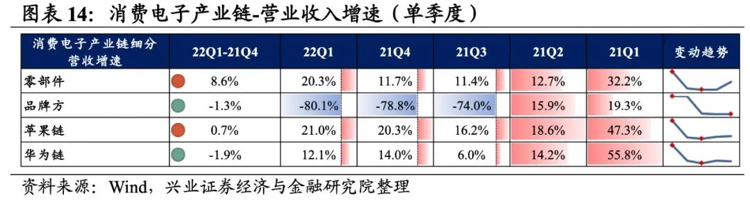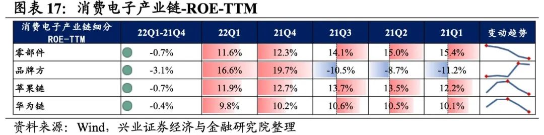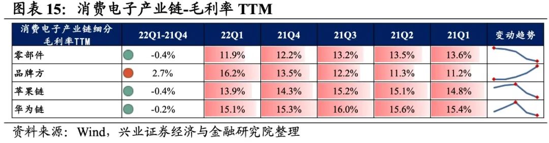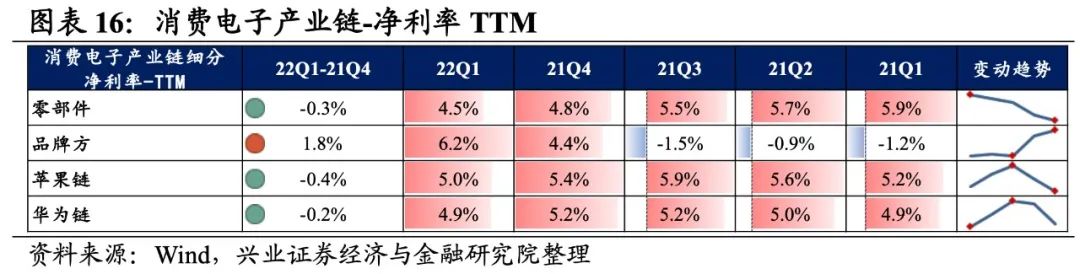 4)华为链:归母净利润增速回落至负增长,盈利能力有所回落。22Q1归母净利润增速、营收增速分别是-1.5%、12.1%,增速较21Q4回落了32.2pct、1.9pct,归母净利润增速回落较多至负增长。盈利能力有所回落,毛利率、净利率均下滑了0.2pct。