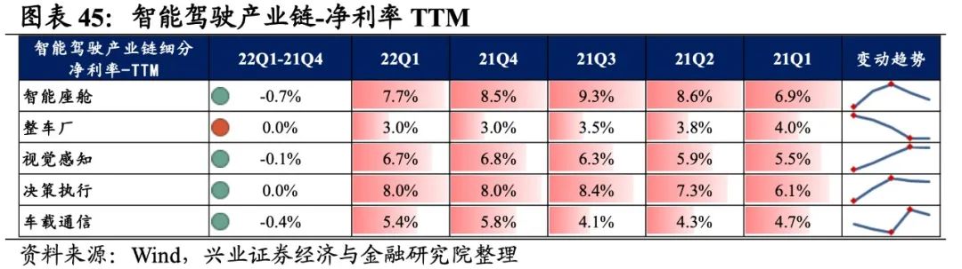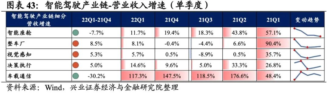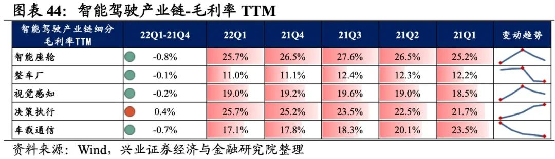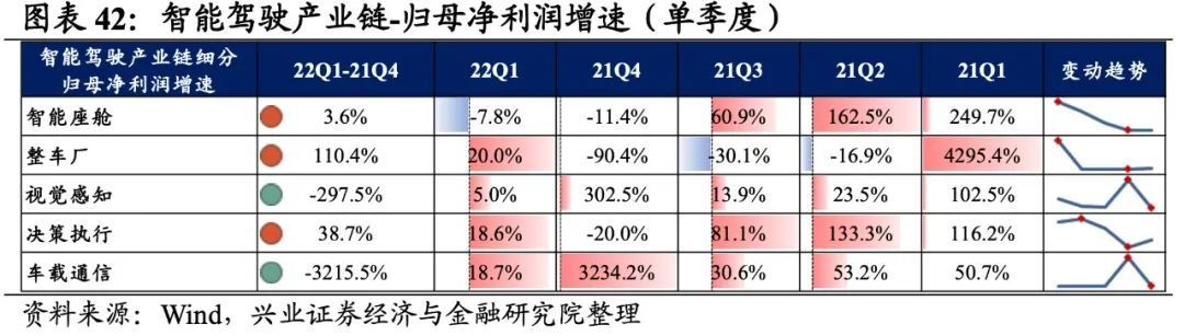 智能驾驶产业链景气度整体有所提升,整车厂归母净利润增速最高,其次是车载通信、决策执行,智能座舱出现负增速。从增速趋势来看,除视觉感知和车载通信环节增速有所回落外,其他环节增速均较21Q4环比提升,其中整车厂提升的幅度最大。盈利能力方面,除决策执行环节毛利率环比提升外,智能座舱、整车厂、视觉感知、车载通信的盈利能力均回落。具体来看: