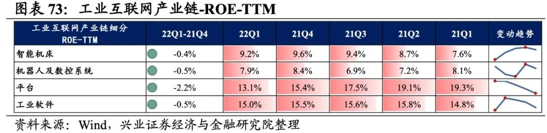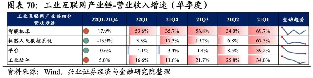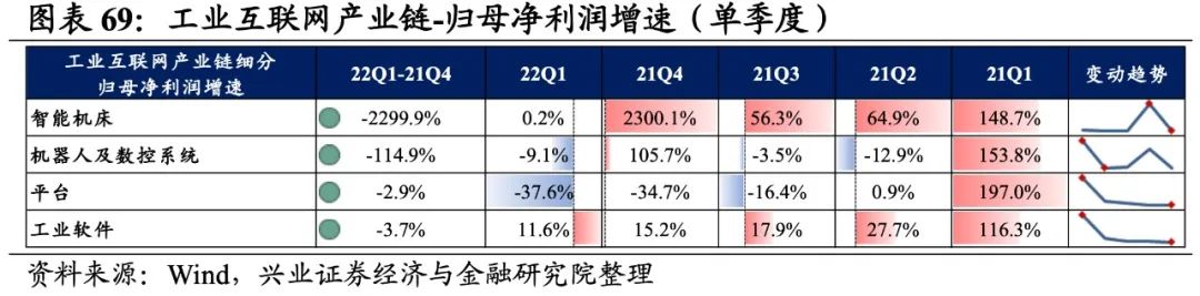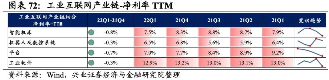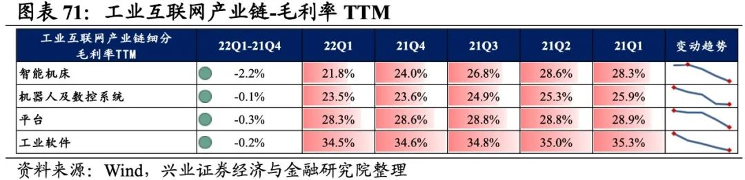 工业互联网产业链环节景气出现分化,平台承压,工业软件归母净利润增速较高,机器人及数控系统、平台录得负增长。从增速趋势来看,所有细分产业链归母净利润增速均下滑,智能机床增速下滑的幅度最大。盈利能力方面,所有细分产业链毛利率或净利率均较21Q4环比下行。具体来看: