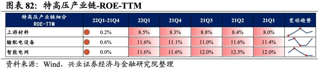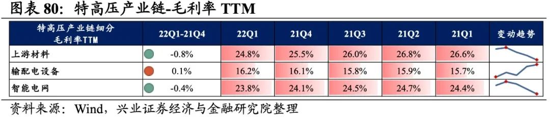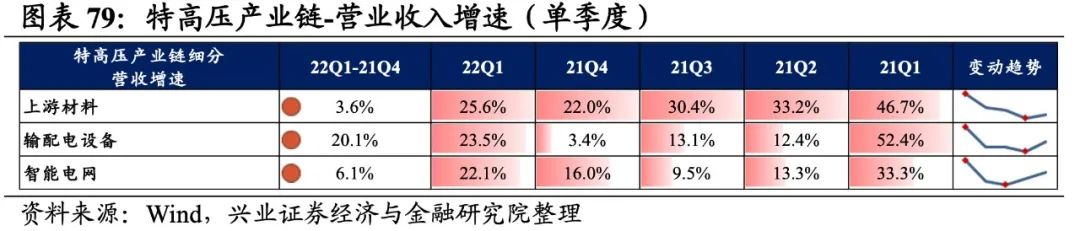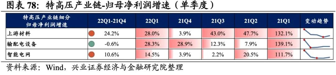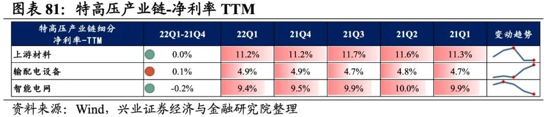 特高压产业链景气度整体加速提升,输配电设备、上游材料归母净利润增速较高,其次是智能电网。从增速趋势来看,除输配电设备外,其余环节归母净利润增速均上行,上游材料增速回升的幅度最大。盈利能力方面,除输配电设备外,其余环节盈利能力均较21Q4有所回落。具体来看: