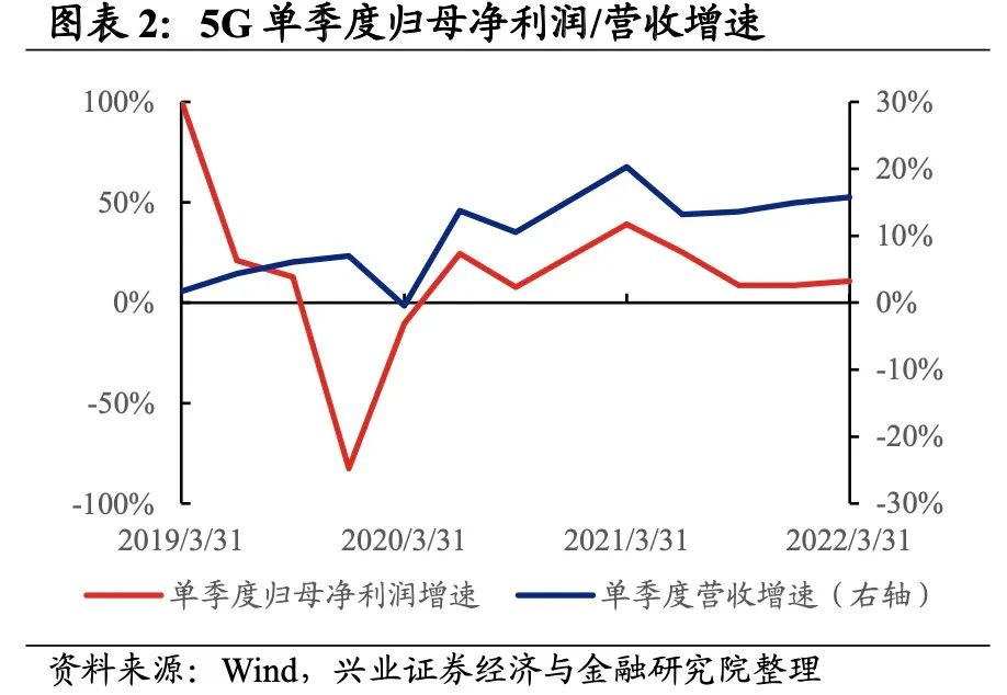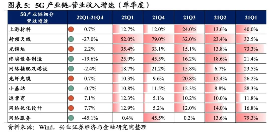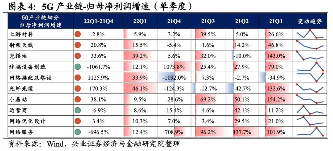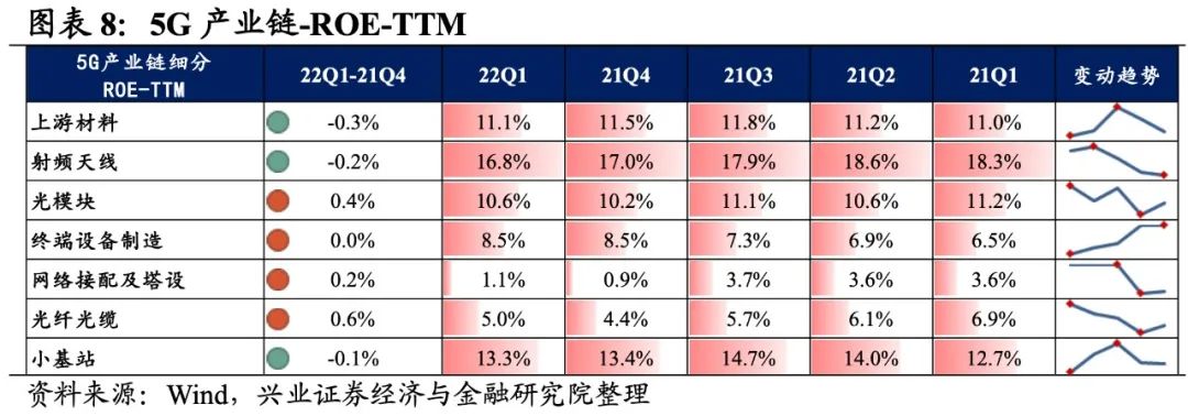 5G产业链整体业绩增速继续回升,但盈利能力小幅回落。从5G产业链整体来看,22Q1单季度归母净利润增速、营收增速分别是10.72%、15.76%,较21Q4单季度增速分别回升2.1pct、0.8pct。但盈利能力小幅回落,毛利率、净利率、ROE分别下降0.3pct、0.1pct、0.2pct。