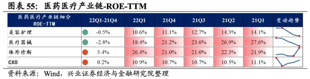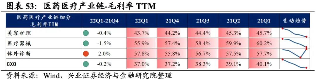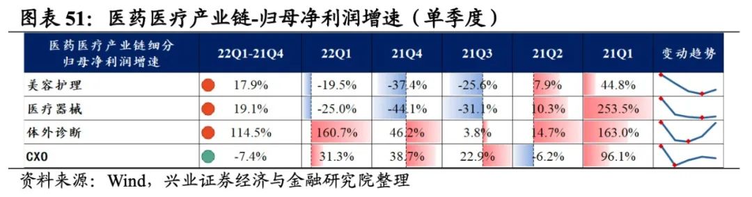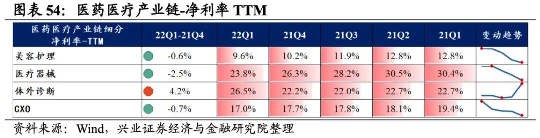 医药医疗产业链景气度出现分化,体外诊断业绩增速最高,其次是CXO,美容护理、医疗器械出现负增长。从增速趋势来看,除CXO外,其余细分产业链归母净利润增速均提升,体外诊断提升的幅度最大。盈利能力方面,仅有体外诊断毛利率或净利率较21Q4环比提升,其余环节盈利能力均有所回落,且医疗器械回落的幅度最大。具体来看:
