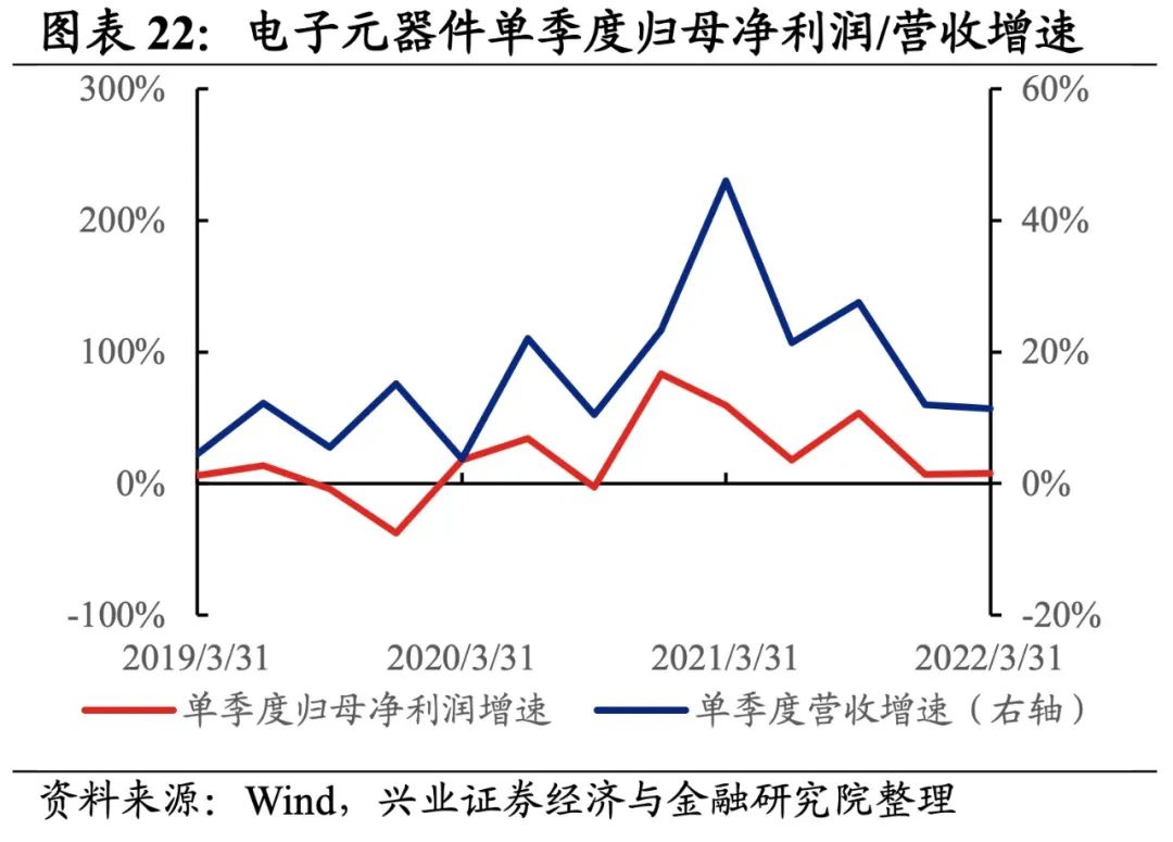 1)被动元器件:归母净利润增速继续回落,盈利能力维持较高水平但边际下滑。22Q1归母净利润增速、营收增速分别是3.8%、13.0%,增速较21Q4回落了6.9pct、提升了1.1pct,归母净利润增速连续两个季度回落。盈利能力维持较高水平,但较21Q4有所回落,毛利率、净利率回落了0.7pct、0.3pct。