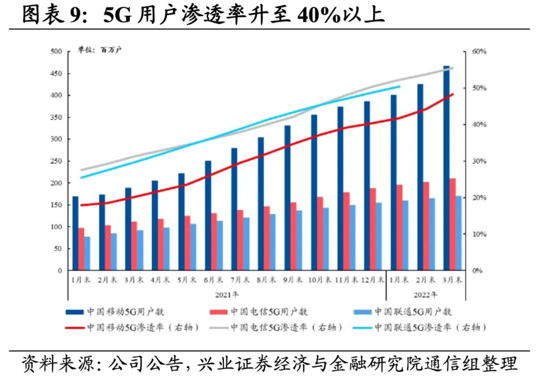 2)运营商方面,伴随提速降费政策缓和、5G用户渗透率的提升,运营商的移动业务ARPU值持续回升,且三大运营商资本开支高峰已过,未来的成本和费用压力预计将显著缓解。收入、成本和费用共振下,运营商基本面拐点已至,且由于高股息、低估值的特性在当下具备较高安全边际。