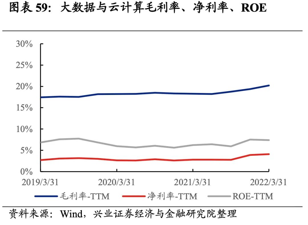 大数据与云计算产业链归母净利润增速大幅回落,盈利能力改善。从大数据与云计算产业链整体来看,22Q1单季度归母净利润增速、营收增速分别是0.61%、-19.71%,较21Q4单季度增速分别回落228.9pct、回升0.3pct。盈利能力改善,毛利率、净利率提升0.8pct、0.2pct,ROE下滑0.2pct。