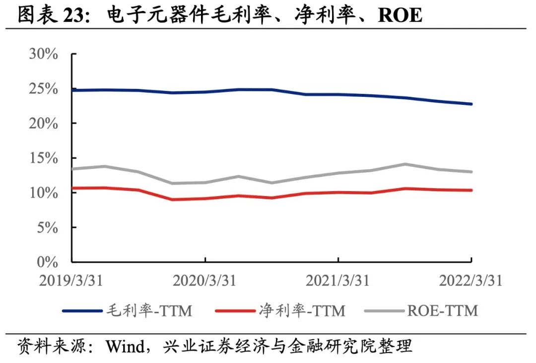 电子元器件产业链业绩增速基本持平,盈利能力有所回落。从电子元器件产业链整体来看,22Q1单季度归母净利润增速、营收增速分别是7.94%、11.38%,较21Q4单季度增速分别提升1.1pct、下滑0.6pct。盈利能力有所回落,毛利率、净利率、ROE下降0.4pct、0.1pct、0.3pct。