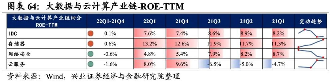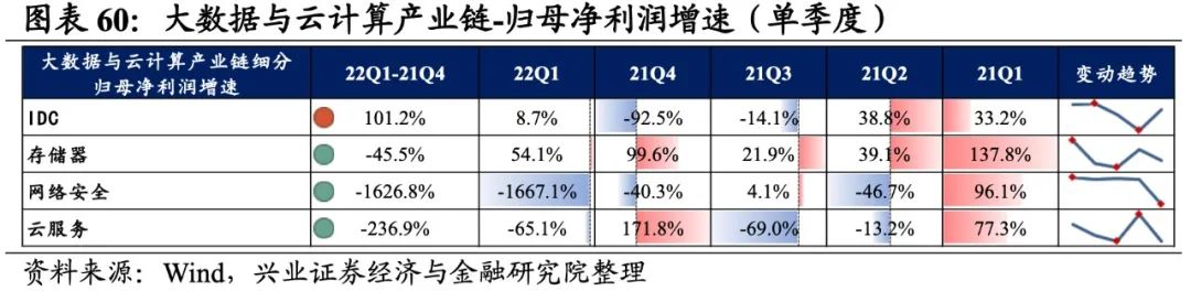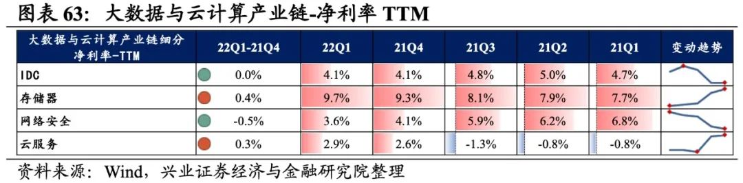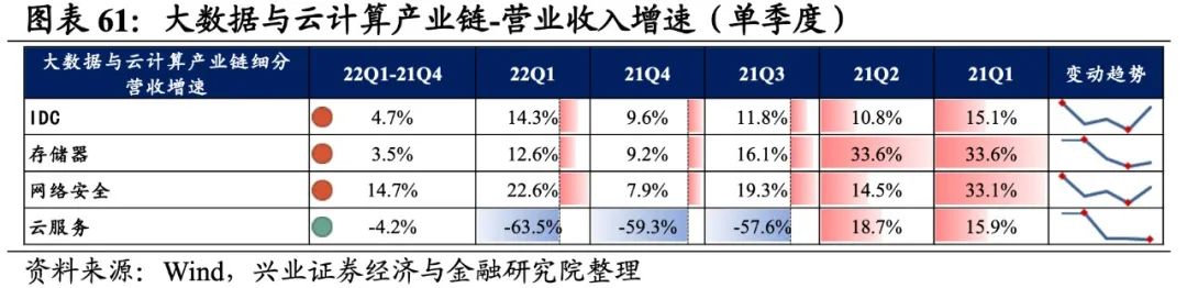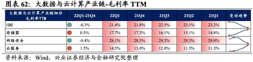 大数据与云计算产业链环节景气出现分化,网络安全承压,存储器归母净利润增速较高,其次是IDC,网络安全则录得大幅负增长。从增速趋势来看,除IDC外,其余细分产业链归母净利润增速均下滑,网络安全增速下滑的幅度最大。盈利能力方面,存储器、云服务盈利能力均较21Q4环比提升,IDC、网络安全毛利率或净利率有所下滑。具体来看:
