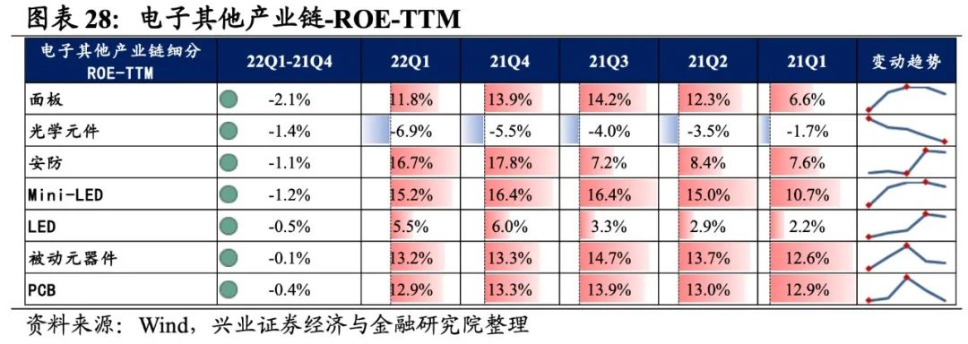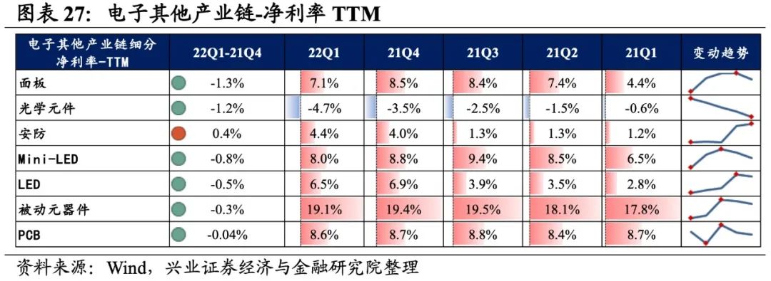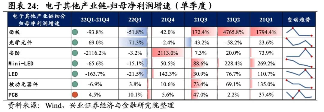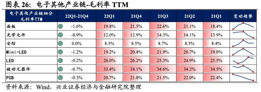 光学光电子产业链景气度回落较大,细分环节归母净利润均为负增长,安防归母净利润增速较高,其次是Mini-LED和LED。从增速趋势来看,所有环节归母净利润增速均下滑,安防增速下滑的幅度最大。盈利能力方面,所有环节毛利率或净利率均较21Q4下滑。具体来看: