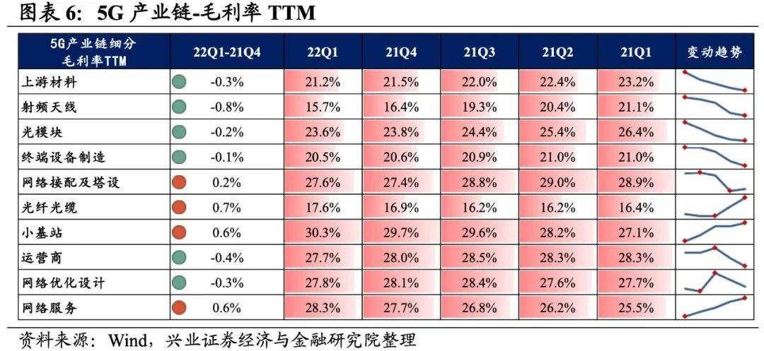 5)网络接配及塔设:归母净利润增速大幅转正,归母净利润增速由负转正。22Q1归母净利润增速、营收增速分别是33.9%、18.7%,增速较21Q4提升了1125.9pct、回落了2.4pct,归母净利润增速大幅转正。盈利能力小幅回升,毛利率、净利率均回升了0.2%。