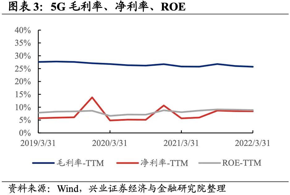 4)终端设备制造:业绩与盈利能力均有所回落。22Q1归母净利润增速、营收增速分别是12.1%、25.9%,增速较21Q4回落了1061.7pct、19.6pct,其中归母净利润增速回落较多,主要是由于永鼎股份、东土科技两只个股回落较大。盈利能力也小幅回落,毛利率、净利率回落了0.1pct、0.2pct。