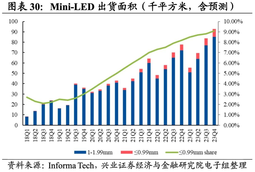3)光学光电子方面,面板价格逐渐见底,伴随着TV市场大尺寸化态势明显,需求有望逐渐回暖,同时伴随着成本降低和技术提升,MiniLED直显市场空间逐步打开,车载显示市场的高速增长以及IT类产品市场的逐步破冰为MiniLED市场空间贡献重要增量。