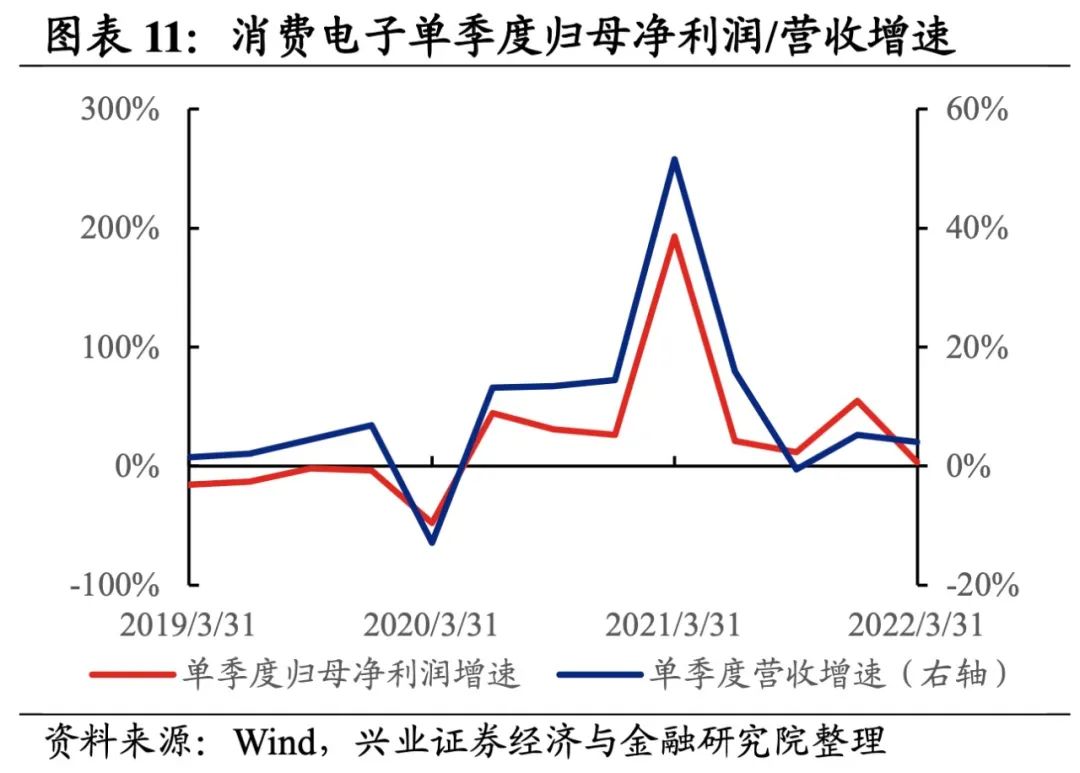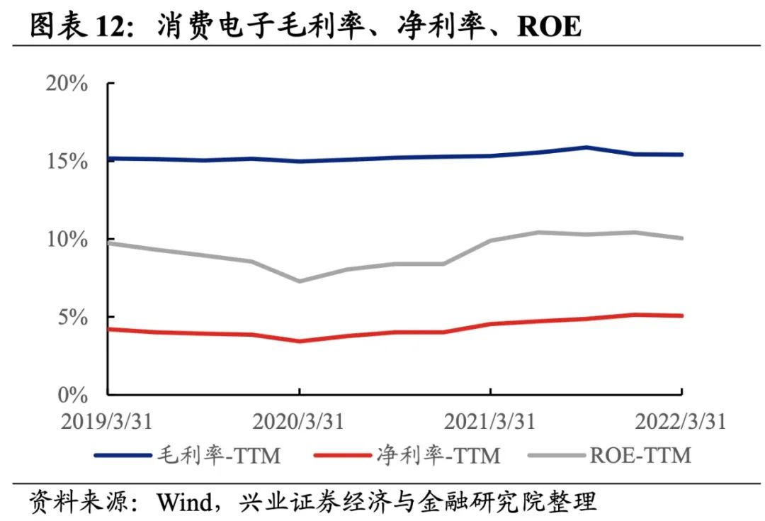 消费电子归母净利润增速大幅回落,盈利能力整体小幅回落。从消费电子整体来看,22Q1单季度归母净利润增速、营收增速分别是2.97%、4.07%,较21Q4单季度增速分别回落51.9pct、1.2pct,归母净利润增速大幅回落,或与海外需求回落、国内疫情蔓延影响产销等因素有关。盈利能力回落,毛利率持平于21Q4,净利率、ROE下降0.1pct、0.4pct。