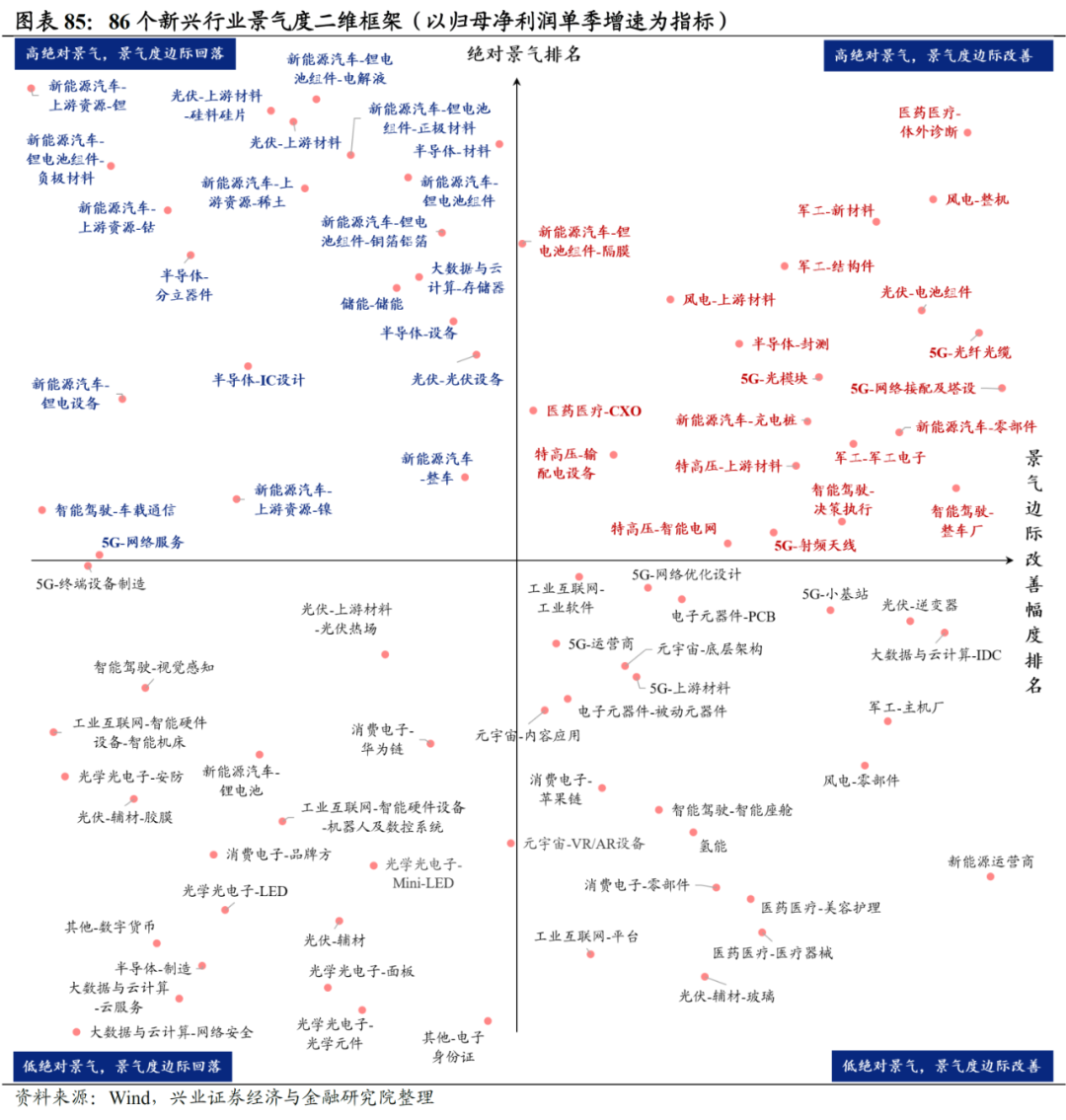 整体来看,“景气度二维框架”下86个新兴细分行业呈现出以下景气分化特征:
