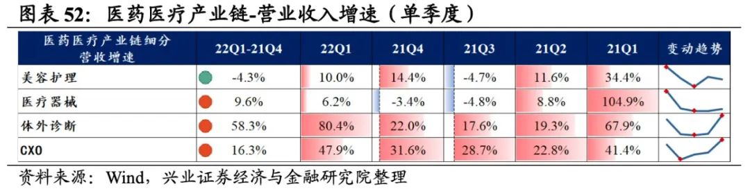 医药医疗产业链涵盖美容护理、医疗器械、体外诊断、CXO,共计4个细分行业。