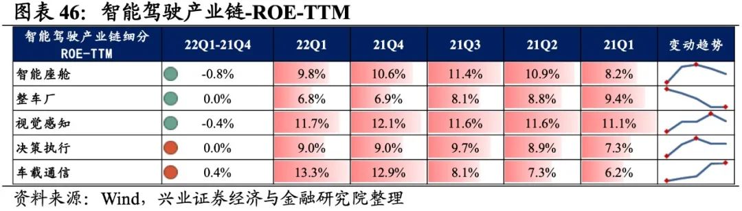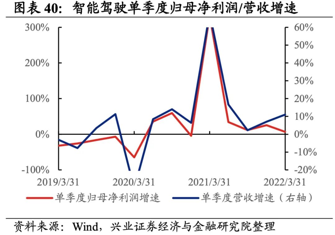 智能驾驶产业链营收增速继续回升但归母净利润增速回落,盈利能力小幅回落。从智能驾驶产业链整体来看,22Q1单季度归母净利润增速、营收增速分别是6.64%、10.99%,较21Q4单季度增速分别回落了18.7pct、回升了4.0pct。盈利能力小幅回落,毛利率、净利率、ROE下滑0.2pct、0.2pct、0.3pct。