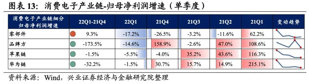 消费电子产业链环节景气度均处于较低水平,归母净利润均为负增长,其中零部件、品牌方缓解归母净利润均呈双位数下滑。从增速趋势来看,除零部件环节外,其余环节归母净利润增速均下滑,品牌方环节增速下滑的幅度最大。盈利能力方面,除品牌方环节毛利率或净利率有所提升,其余环节盈利能力均较21Q4有所下滑。具体来看: