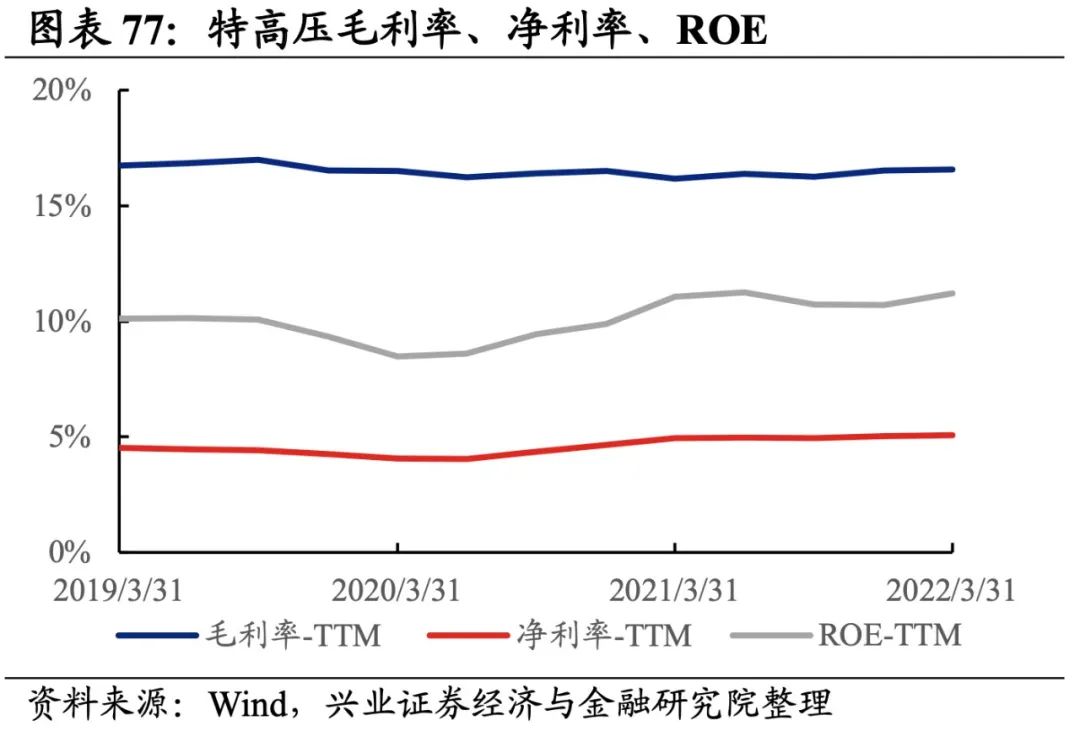 特高压产业链整体业绩触底回升,盈利能力改善。从特高压产业链整体来看,22Q1单季度归母净利润增速、营收增速分别是27.38%、23.7%,较21Q4单季度增速分别回升3.1pct、18.6pct。盈利能力改善,毛利率、净利率持平,ROE提升0.5pct。