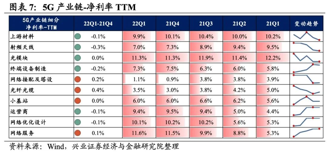 5G产业链环节景气出现分化,光纤光缆净归母净利润增速较高,其次是光模块、网络接配及塔设环节。从增速趋势来看,终端设备制造、网络服务和运营商环节归母净利润增速下滑,其他环节归母净利润增速均较21Q4提升,其中网络接配及塔设归母净利润增速提升的幅度最大。盈利能力方面,网络接配及塔设、光纤光缆、小基站、网络服务环节毛利率、净利率均较21Q4有所提升,而其余环节盈利能力下滑,且射频天线环节盈利能力下滑幅度最大。具体来看: