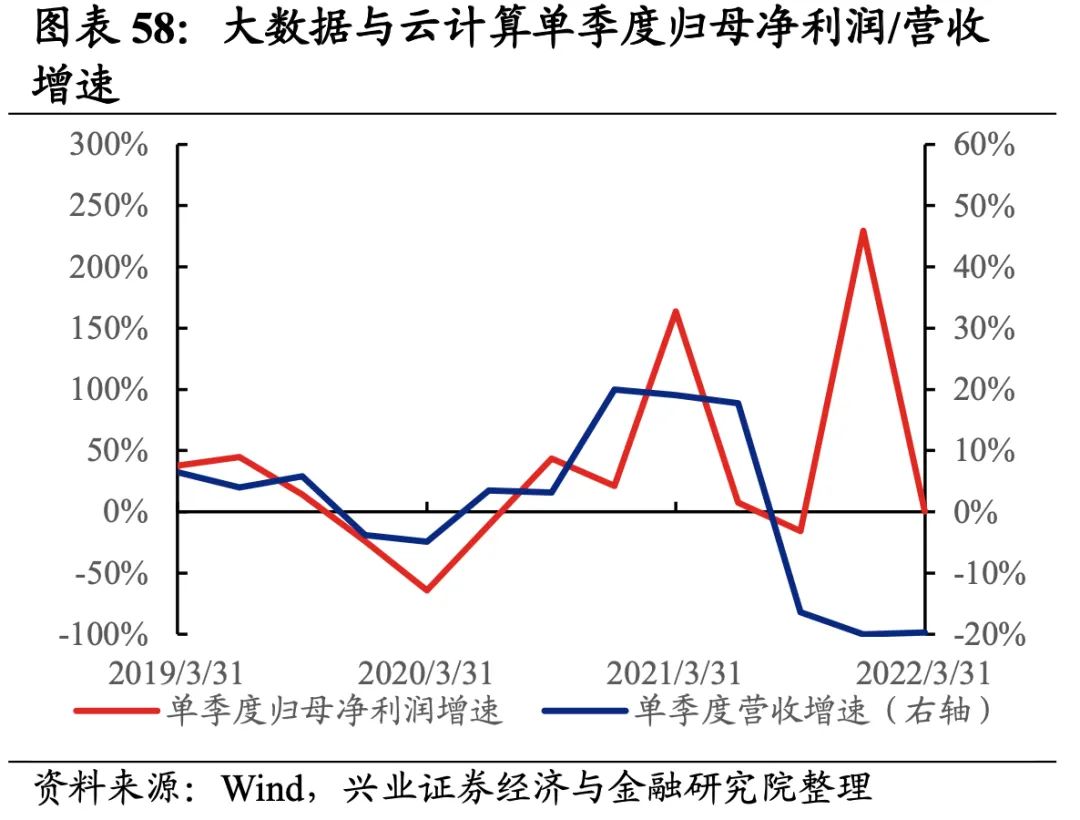 往后看,随着数字经济产业接连迎来政策红利以及北美云计算厂商Q1资本开支继续超预期,大数据和云计算赛道景气度有望迎来提升,不过短期业绩压力仍存。自今年1月《“十四五”数字经济发展规划》正式出台以来,数字经济产业接连迎来政策红利。今年2月,“东数西算”工程正式全面启动,数据中心相关的IDC、存储器领域迎来重大发展机遇。4月中央全面深化改革委员会第二十五次会议中,总书记也强调了数据安全、数字政府安全管理的重要性,网络安全行业盈利能力后续有望在相关政策加持下逐步改善。云计算方面,北美厂商Q1资本开支超预期彰显云计算高景气持续,国内BAT、三大运营商为首的云计算龙头企业资本开支也整体维持较高增速,在企业数字化转型的进程中业绩有望逐步放量。不过,当前国内大数据和云计算产业业绩放量或仍需时日,后续建议持续关注政策支持下云计算基础设施的建设情况、以及下游需求的后续释放情况。投资选择上优先关注受益于数据中心建设的IDC环节,以及全球云服务器需求激增催化下的存储器环节。