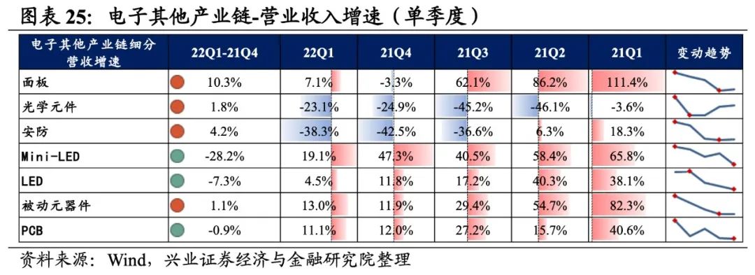 5)LED:归母净利润增速大幅回落至负增长,盈利能力有所回落。22Q1归母净利润增速、营收增速分别是-21.5%、4.5%,增速较21Q4回落了163.7pct、7.3pct,归母净利润增速大幅回落至负增长。盈利能力有所回落,毛利率、净利率下滑了0.2pct、0.5pct。