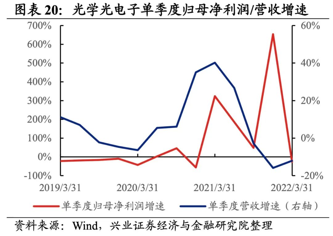 2)光学元件:归母净利润加速下滑,盈利能力继续回落。22Q1归母净利润增速、营收增速分别是-71.3%、-23.1%,增速较21Q4回落了69.0pct、提升了1.8pct,归母净利润加速下滑。盈利能力继续回落,毛利率、净利率下滑了0.9pct、1.2pct,均出现连续两个季度回落的情况。