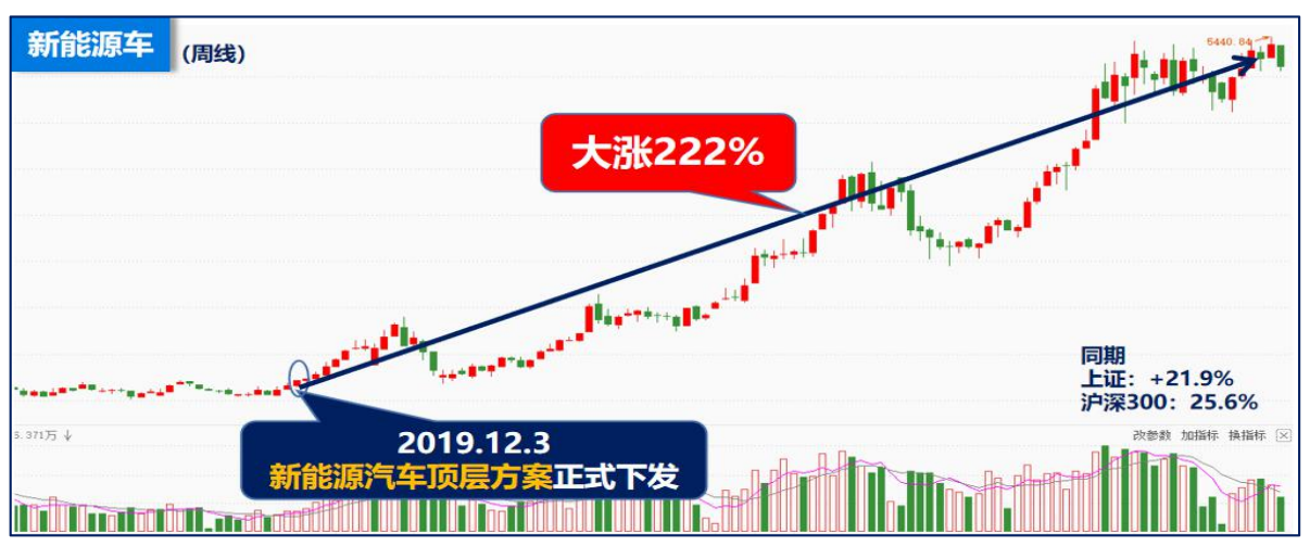 历史上顶层方案催化出一波强势的主升浪行情,例如2019年新能源汽车顶层方案下发,随后新能源车板块大涨222%,同时板块内也走出诸多翻倍股。