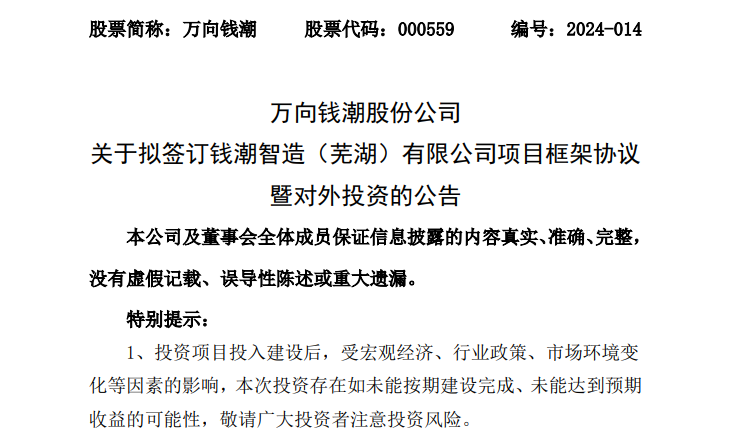 万向钱潮公告显示,拟与芜湖经济技术开发区管理委员会(下称“芜湖经开区管委会”)就年产900万支等速驱动轴研发制造项目签订框架协议,项目总投资不超出15亿元。