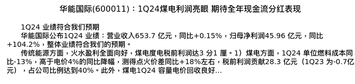 值得注意的是:2024年04月中金公司的刘佳妮/陈显帆/刘砺寒分析师,首次发布关于华能国际的研究报告,标题为:华能国际(600011):1Q24煤电利润亮眼 期待全年现金流分红表现。