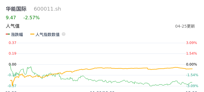 04月25日,华能国际收报9.47,股价涨幅-2.57%,成交金额5.88亿元,换手率0.56%。