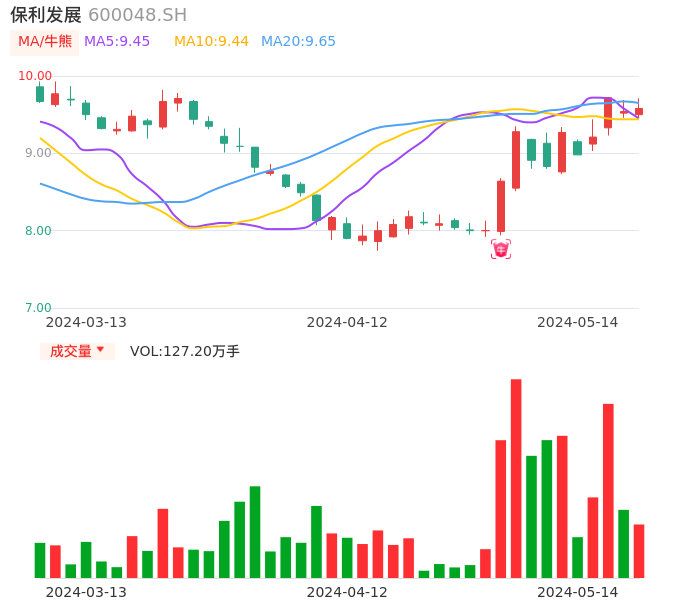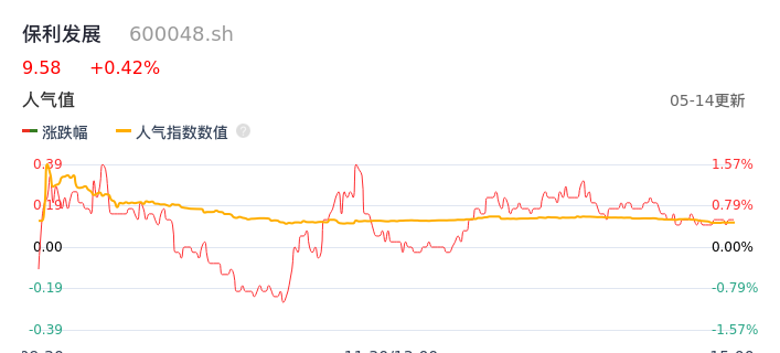05月14日,保利发展收报9.58,股价涨幅0.42%,成交金额12.20亿元,换手率1.06%。