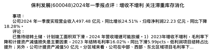 值得注意的是:2024年05月华创证券的单戈分析师,首次发布关于保利发展的研究报告,标题为:保利发展(600048)2024年一季报点评:增收不增利 关注滞重库存消化。