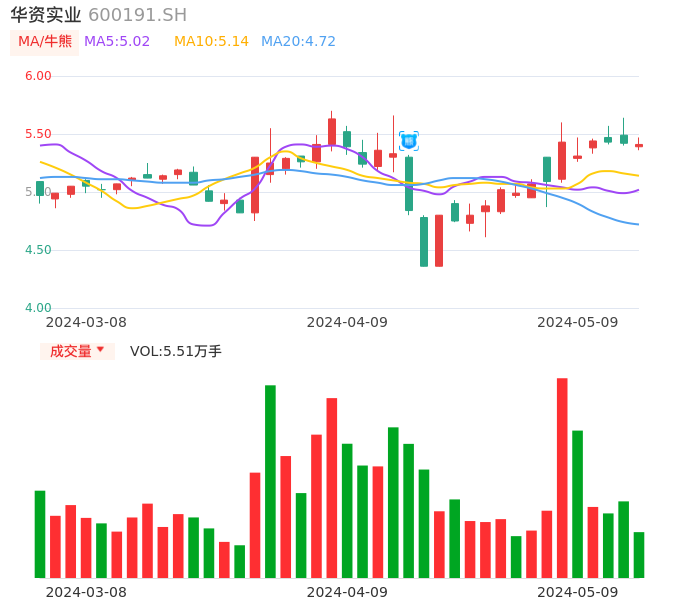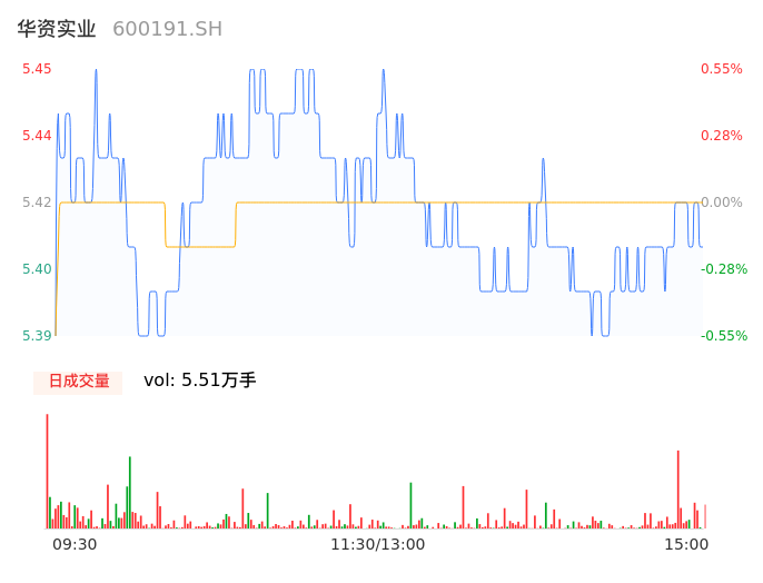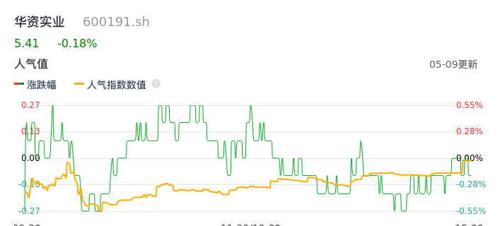 05月09日,华资实业收报5.41,股价涨幅-0.18%,成交金额2985.53万元,换手率1.14%。