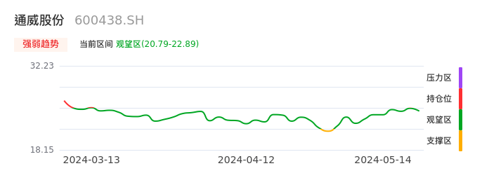 我们来看一下该股的九方特色指标强弱趋势的情况:通威股份自04月26日从支撑区回到观望区。股价经过前期快速下跌后中途弱势整理。现在下跌动能有重新放大迹象,弱势反弹行情可能临近尾声。建议继续谨慎观望。
