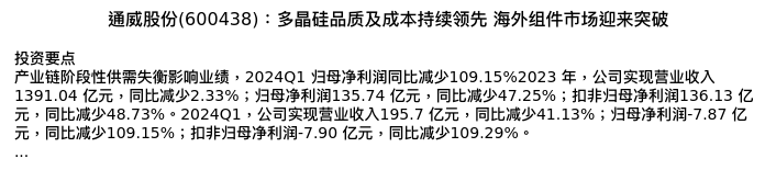值得注意的是:2024年05月浙商证券的张雷/陈明雨/谢金翰/尹仕昕分析师,首次发布关于通威股份的研究报告,标题为:通威股份(600438):多晶硅品质及成本持续领先 海外组件市场迎来突破。