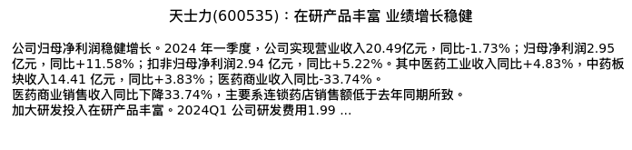 值得注意的是:2024年04月东方财富证券的何玮分析师,首次发布关于天士力的研究报告,标题为:天士力(600535):在研产品丰富 业绩增长稳健。