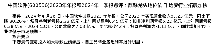 值得注意的是:2024年05月东吴证券的王紫敬/王世杰分析师,首次发布关于中国软件的研究报告,标题为:中国软件(600536)2023年年报和2024年一季报点评:麒麟龙头地位依旧 达梦行业拓展加快。