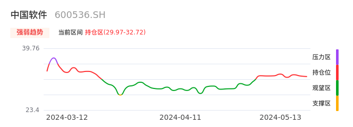 我们来看一下该股的九方特色指标强弱趋势的情况:中国软件自04月29日从观望区上穿到持仓区。股价近期在多头区域回调整理。后续重点关注多空分界点的争夺:29.97元。如未能有效站稳则可能重新回到空头行情。