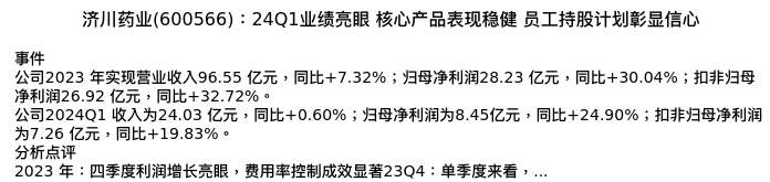 值得注意的是:2024年05月华安证券的谭国超/李昌幸分析师,首次发布关于济川药业的研究报告,标题为:济川药业(600566):24Q1业绩亮眼 核心产品表现稳健 员工持股计划彰显信心。
