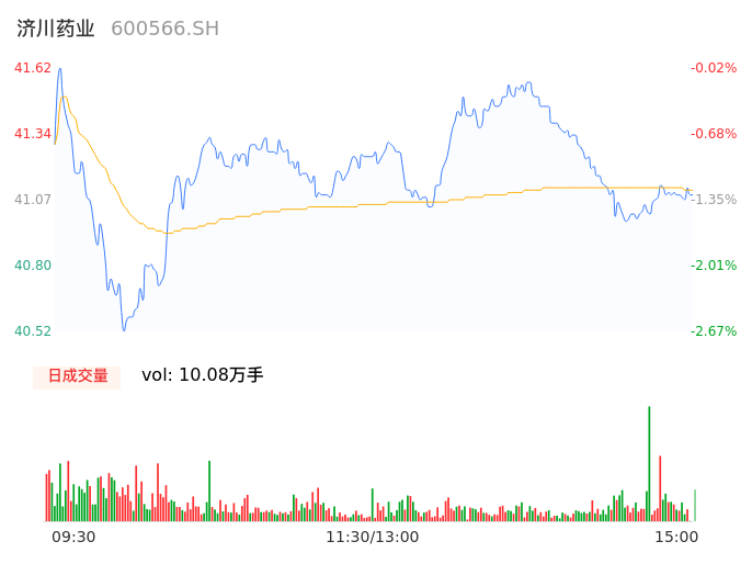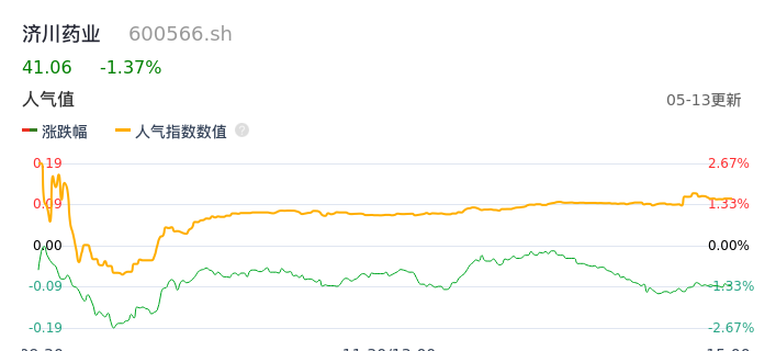05月13日,济川药业收报41.06,股价涨幅-1.37%,成交金额4.15亿元,换手率1.10%。