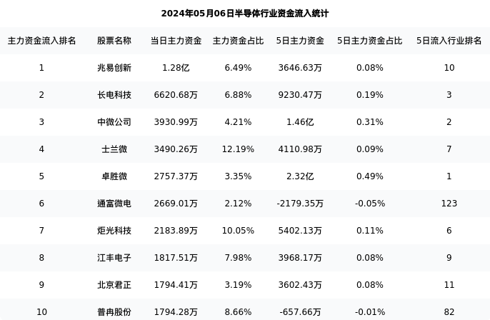 下表为今日行业内流入前10股票的信息