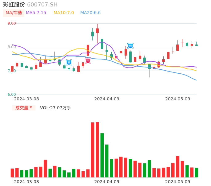 05月09日,彩虹股份收报8.06,股价涨幅-0.74%,成交金额2.20亿元,换手率0.75%。