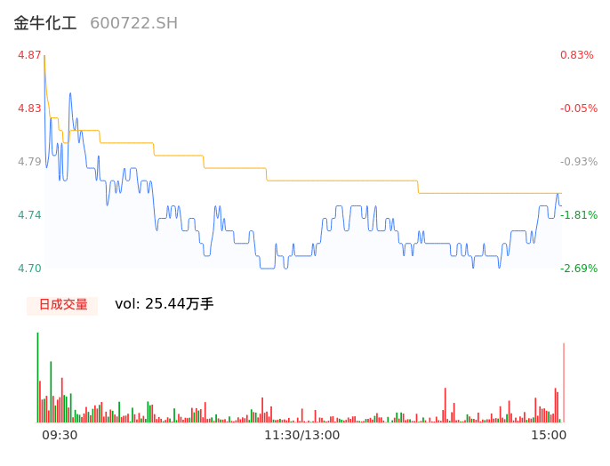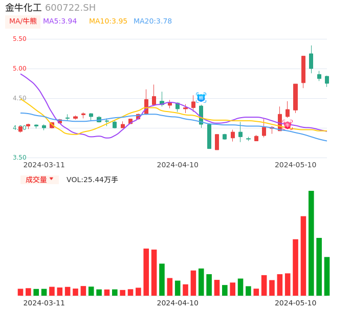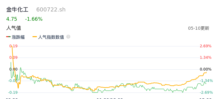 05月10日,金牛化工收报4.75,股价涨幅-1.66%,成交金额1.21亿元,换手率3.74%。