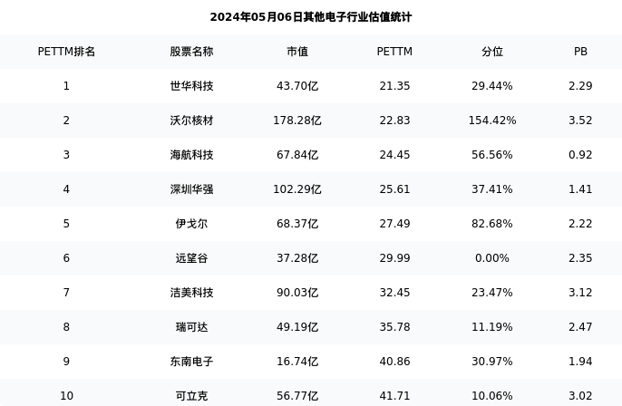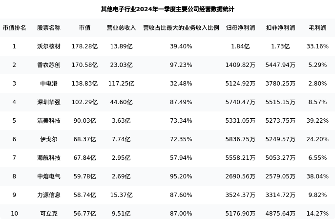 海航科技最新报告期数据为一季度,下表汇总了其他电子行业内市值靠前的公司一季度主要经营数据