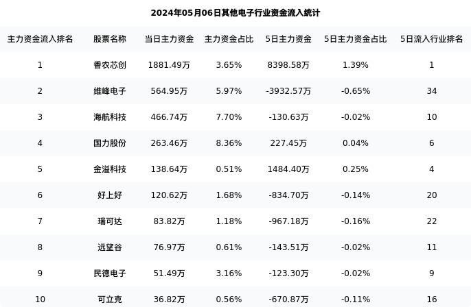 从主力资金流向来看,其他电子行业今日主力资金流入21.28亿元,在所有申万二级行业中排名:78/131。