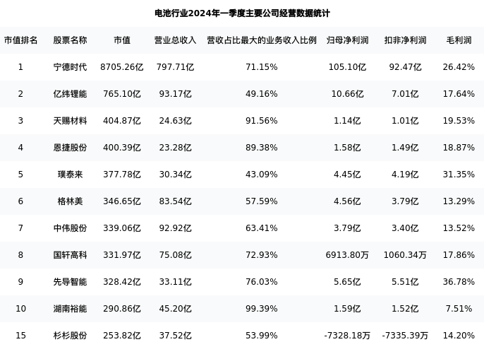 杉杉股份最新报告期数据为一季度,下表汇总了电池行业内市值靠前的公司一季度主要经营数据