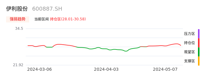 我们来看一下该股的九方特色指标强弱趋势的情况:伊利股份自04月18日从观望区上穿到持仓区。股价近期在多头区域回调整理。后续重点关注多空分界点的争夺:28.01元。如未能有效站稳则可能重新回到空头行情。