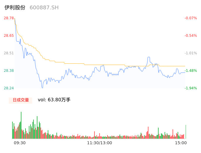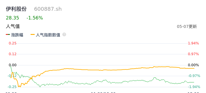 05月07日,伊利股份收报28.35,股价涨幅-1.56%,成交金额18.12亿元,换手率1.01%。