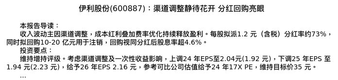 值得注意的是:2024年05月国泰君安国际的訾猛分析师,首次发布关于伊利股份的研究报告,标题为:伊利股份(600887):渠道调整静待花开 分红回购亮眼。